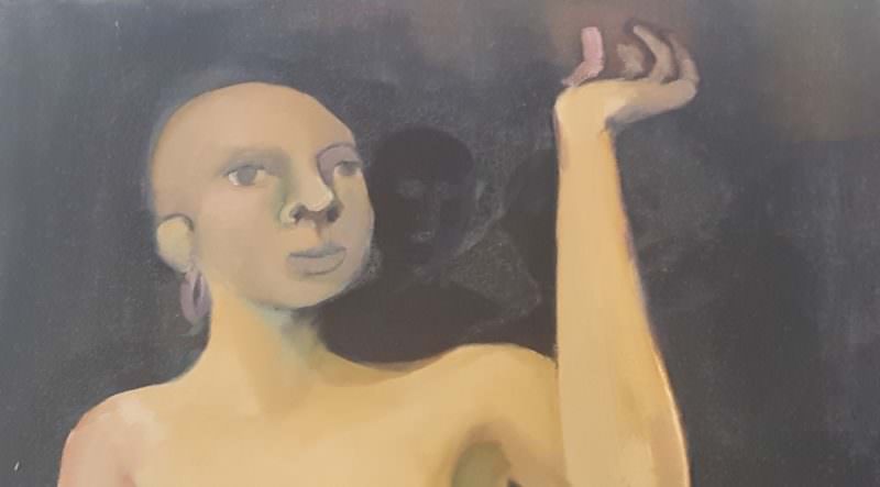 The painting has been in a humid room for a long time. The humidity had a different effect on each layer of paint. As a consequence, an underlying paint layer has become clearly visible. The uniqueness of this effect is that both paint layers now seem to form an integrated composition and as such a new artwork is created – although not how it was intended by the artist.