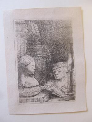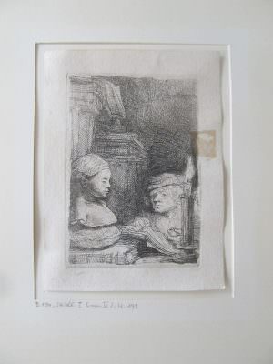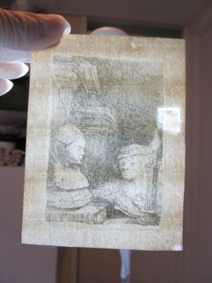 In dit voorbeeld ziet u de restauratie van een originele gravure van Rembrandt. Deze gravure heeft een storende vlek die veroorzaakt is door lijmresten. Op de middelste foto is dit zeer duidelijk waarneembaar. In het eindresultaat is de vlek vgeheel erwijderd en visueel niet meer zichtbaar. Tegelijkertijd is de gravure ook behandeld met een ontzuringsvloeistof ter conservering om verdere achteruitgang in te toekomst te voorkomen.