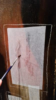 - Allereerst wordt er warme lijm geïnjecteerd in de blaasjes. Van tevoren hebben we onderzocht welke lijm sterk genoeg gaat zijn om de verflaag weer vastgelijmd te kunnen houden op de onderlaag. Voor toepassing op de blaasjes hebben we handmatig een speciale lijm van vissenhuid gemaakt;