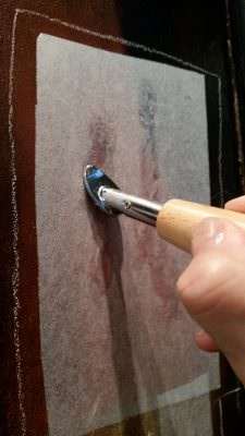 - Vervolgens wordt de bubbel geëgaliseerd met een speciaal instrument, de zogenaamde “heated spatula”. Dit instrument kun je vergelijken met een strijkijzer om kreukels glad te strijken Op deze manier wordt de verflaag vastgelijmd op de ondergrond. Eventueel overtollige lijm wordt verwijderd;